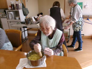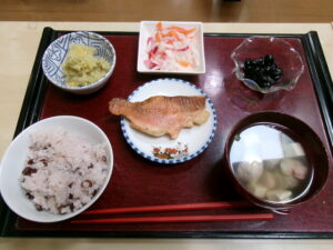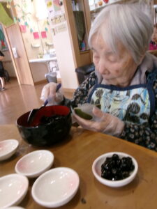 赤飯・魚の煮つけ・栗きんとん・黒豆(市販)・つみれのお吸い物の完成です!!「うれし~」との声が聞かれ皆さんおいしく召し上がって頂いたご様子でした。